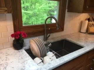 Check out this sink! This full-size sink offers a dish drain section big enough to hold up to six place settings with silverware. It also comes with a beautiful cutting board which fits over either side of the sink to add a little more work space. RCK Sinks are based and distributed right here in Connecticut. The Edge Countertops, Inc. is proud to partner with RCK Sinks, so come on in to see it today. Now you have room for that awesome mixer!